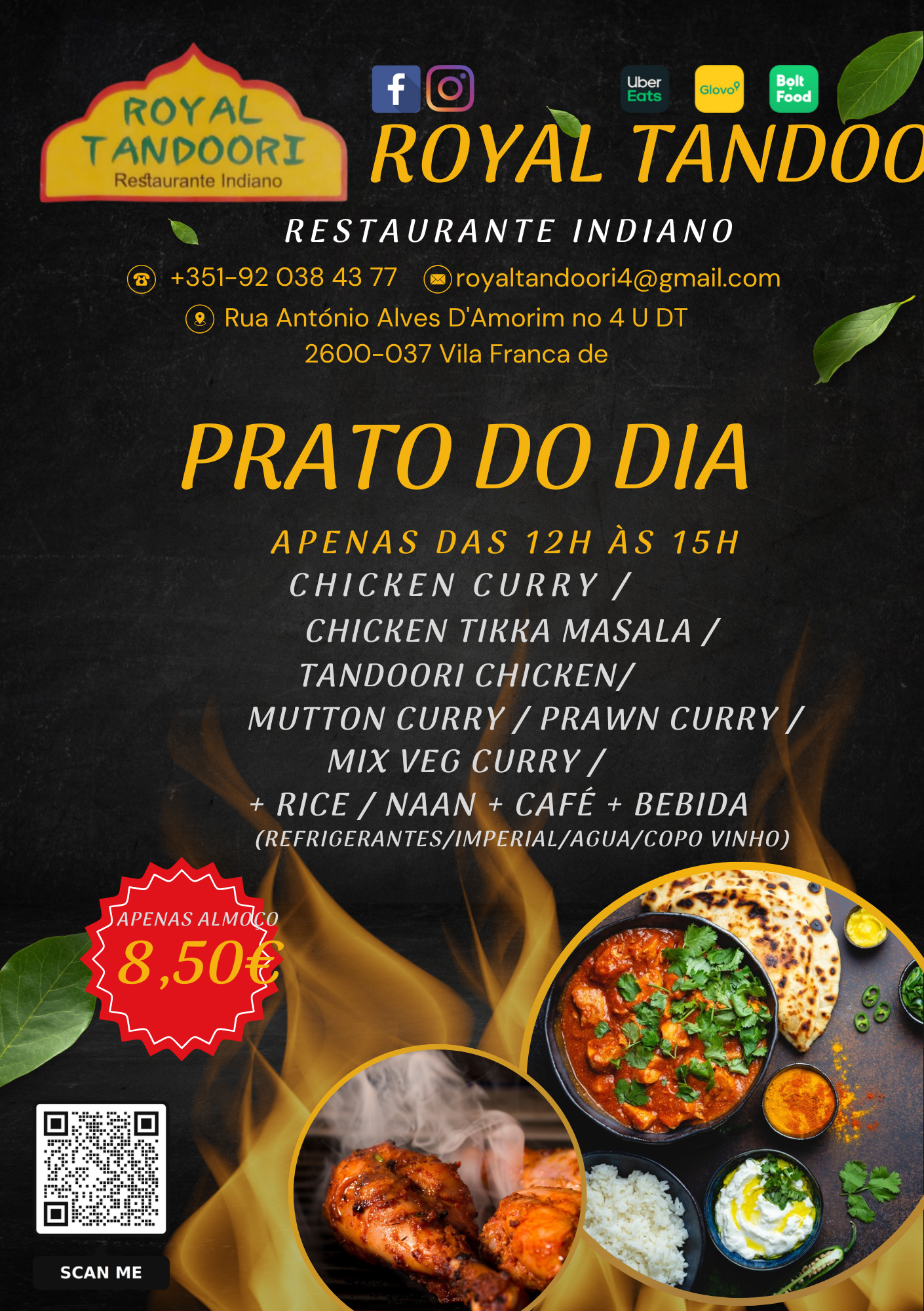 At Royal Tandoori, every day brings a new culinary experience inspired by the rich flavors... At Royal Tandoori, every day brings a new culinary experience inspired by the rich flavors of India. Our Prato do Dia (Dish of the Day) is freshly prepared by our chefs using seasonal ingredients and traditional spices — a perfect balance of taste, aroma, and authenticity. See more See less